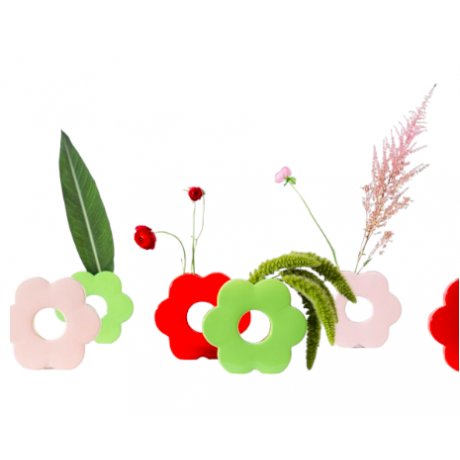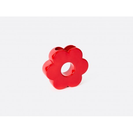 Jarrón de cerámica policromado en rojo con forma de flor roja.