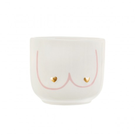 Macetero de cerámica decorada con dos "Boobies" rosas y un par de modestos corazones dorados, sobre una base blanca minimalista.