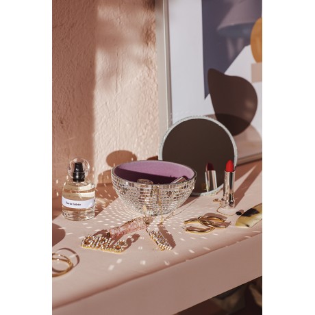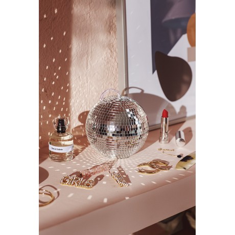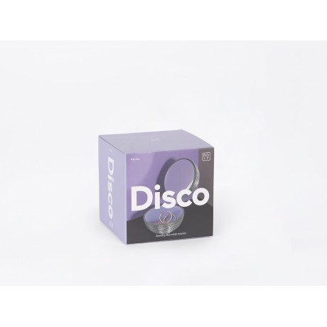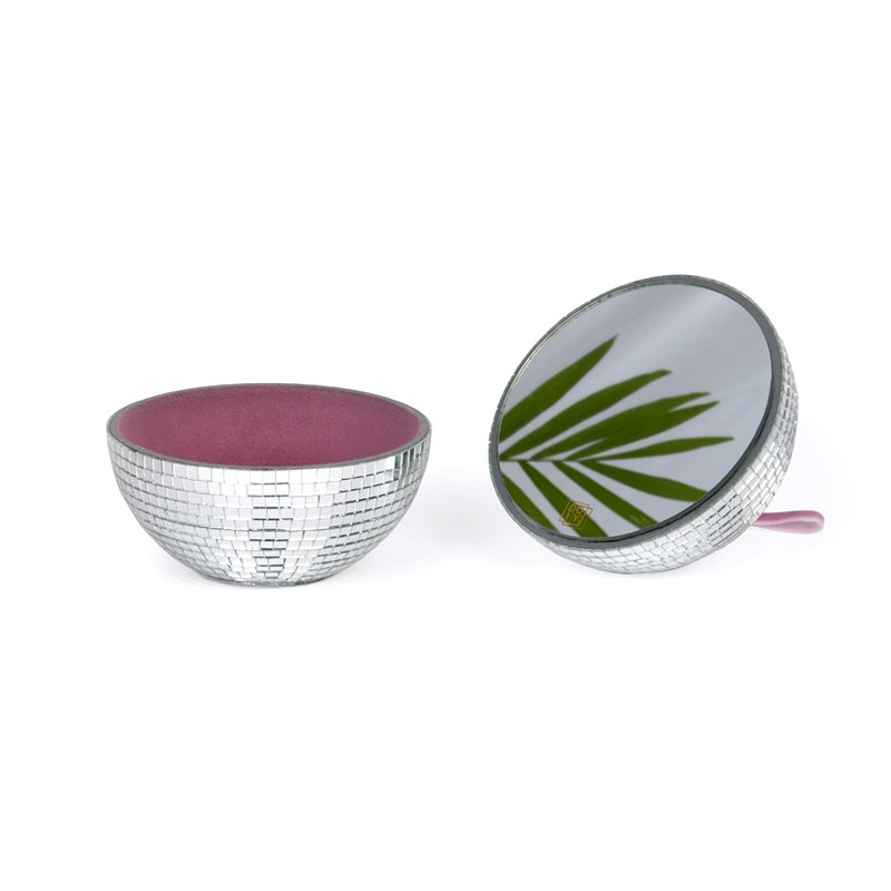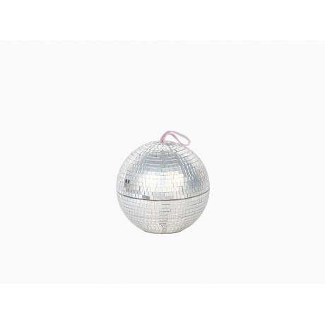 Joyero con forma de bola disco clásica de los años 70, se abre por la mitad, una de las partes tiene un espejo con un asa y la otra mitad es un contenedor para guardar tus alhajas más preciadas.