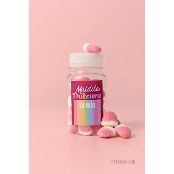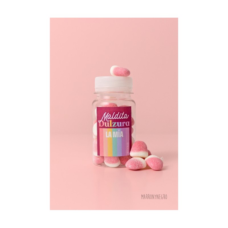 Pildorero Maldita dulzura la mía, porque simpre as sido muy dulce, pero también perfecto para regalar. Con golosinas de mini besos de fresa para disfrutar de su dulzura.