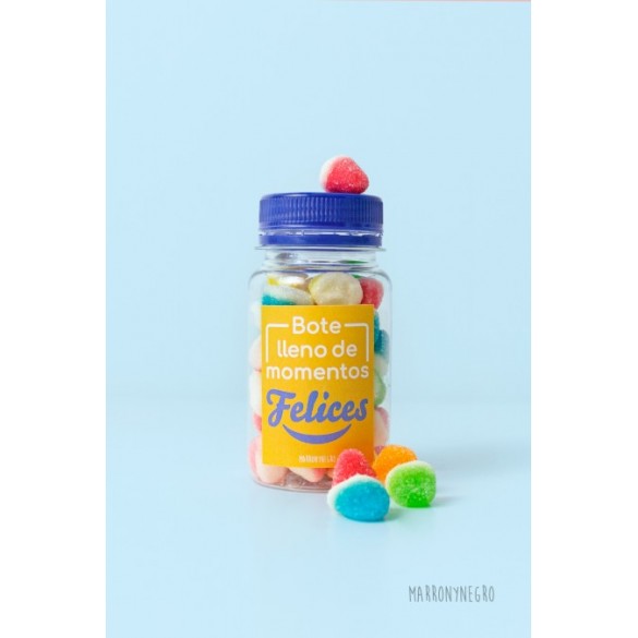 Pildorero Bote lleno de momentos felicez, perfecto para regalar a esa persona con la que has compartido tantos momento felices. Con golosinas de mini besos variados de fresa para disfrutarlas juntos.